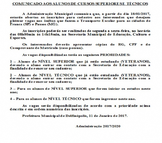 ESTÃO ABERTAS AS INSCRIÇÕES PARA SE CADASTRAR COM A FINALIDADE DE OBTER VAGAS NOS ÔNIBUS QUE FAZEM O TRANSPORTE ESCOLAR PARA AS CIDADE DE FRANCA (SP) E PASSOS (MG).