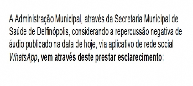 A Secretaria de Saúde de Delfinópolis coloca-se à disposição através de telefone – (35) 3525-1550, e-mail: sa***@*****************ov.br ou pessoalmente, à Rua José Christóstomo de Castro, 41 – Centro – Delfinópolis – MG, em horário das 8h00min às 14h15min, de segunda a sexta feira.